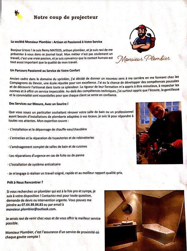 Monsieur Plombier est ravi d'avoir reçu un coup de projecteur dans le journal local de Saint Martin des Champs ! Cette reconnaissance témoigne de notre engagement envers la qualité et la satisfaction de nos clients. Un grand merci à la commune de Saint-Martin-des-Champs pour son soutien .